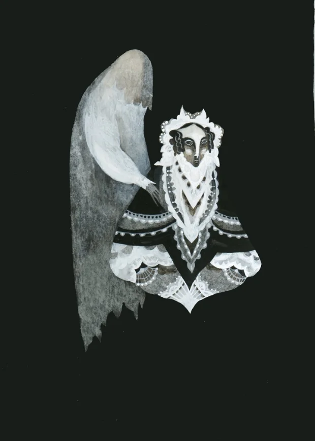 BEREAVED #3  / tissue paper, gouache, graphite & enamel on paper  (mounted in wood shadowbox) / 31" x 33"