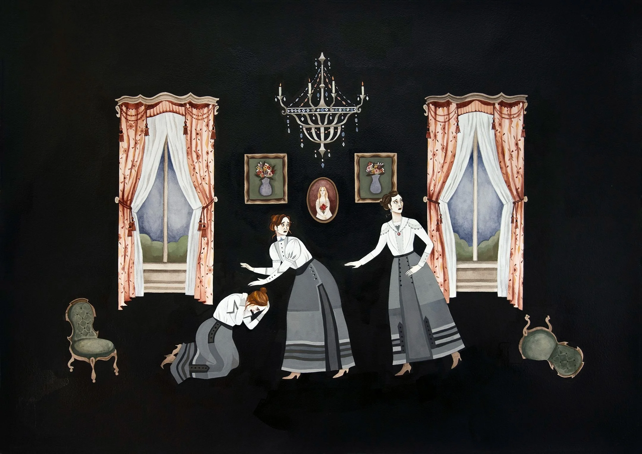 This body of work marked a shift in focus away from female archetypes and folklore to explore some of the harder things we go through in life such as violence, loss, mental illness, fear and trauma. As with my earlier work, these pieces take the form of ambiguous narratives that allow the viewer to bring their own life experience and references to the piece, and walk away with their own personal interpretation. I love film, and I approached these paintings as if they were stills from films that don’t exist. This allowed me to use melodrama, character archetypes and vaguely historical settings to tell stories about real things such as loss violence and mental illness such in a somewhat fantastical and coded way. All of the ideas at the core of this work are based in real life experience, and by using cinematic/archetypal imagery, I hope that I've created a somewhat safe space to invite viewers to think about these hard things and maybe even see some of themselves in these stories.